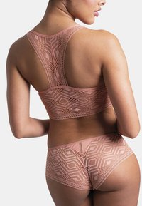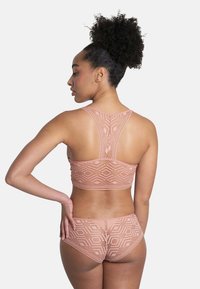 Bralette en dentelle rose clair avec des motifs géométriques, larges bretelles et culotte hipster assortie, avec une texture douce et un design sans couture.