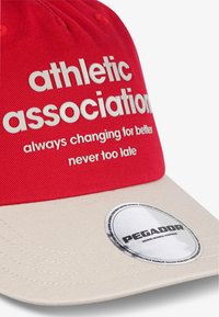 Casquette de baseball rouge avec une visière crème. Présente un texte blanc indiquant "association athlétique" et un patch de logo circulaire sur la visière.