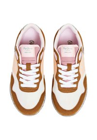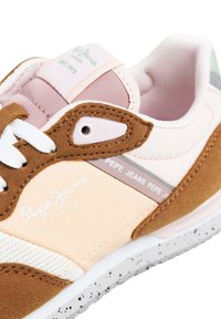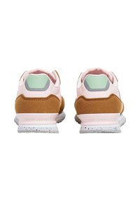 Baskets marron et rose en matériaux mesh et daim, avec des lacets blancs, une semelle blanche mouchetée et un logo sur le côté.