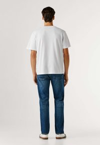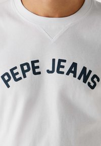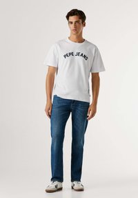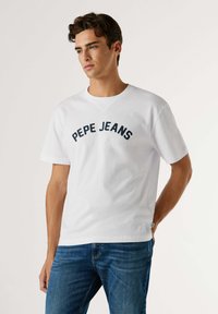 Jeune homme portant un t-shirt blanc Pepe Jeans et un jean bleu, debout devant un fond clair uni.
