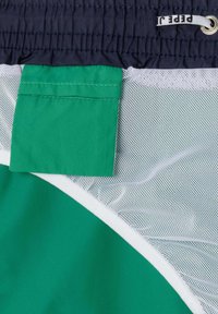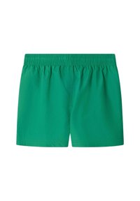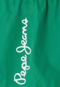 Shorts de bain verts avec taille élastique et cordon de serrage blanc, arborant le logo "Pepe Jeans" verticalement sur la jambe droite.