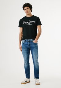 Jeune homme les mains dans les poches portant un T-shirt noir "Pepe Jeans London" et un jean bleu sur un fond clair uni.