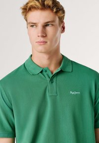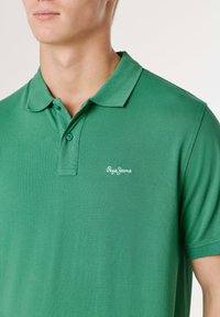 Jeune homme portant un polo vert et un jean bleu clair, tenant une veste en denim dans la main gauche, devant un fond uni.