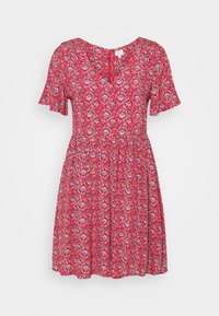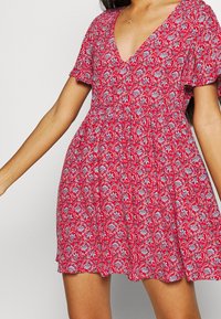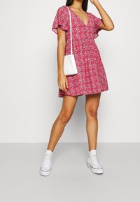 Femme portant une robe courte rouge à motifs floraux avec des manches volantes et des baskets montantes blanches, debout devant un fond blanc uni.