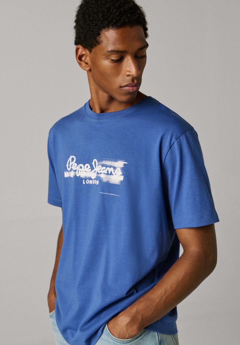 T-shirt en coton bleu à manches courtes, col rond, avec un logo blanc imprimé. Présente une coupe décontractée et une texture douce.