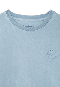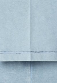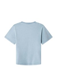 T-shirt à manches courtes bleu clair en tissu doux, avec un col ras du cou et un petit logo circulaire sur la poitrine.