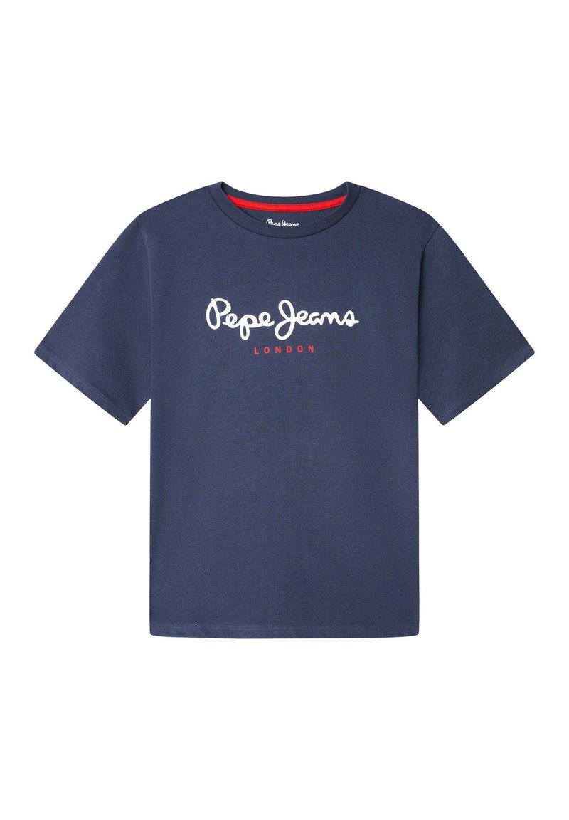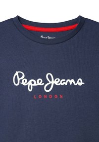 T-shirt bleu marine à manches courtes en coton. Présente un logo "Pepe Jeans" blanc avec "LONDON" en rouge en dessous. Col rond.