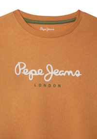 T-shirt orange à manches courtes en coton, avec l'inscription blanche "Pepe Jeans" et "LONDON" en vert en dessous, col rond et coupe standard.