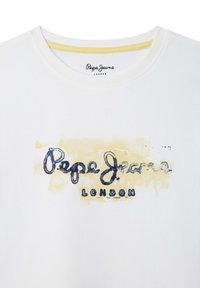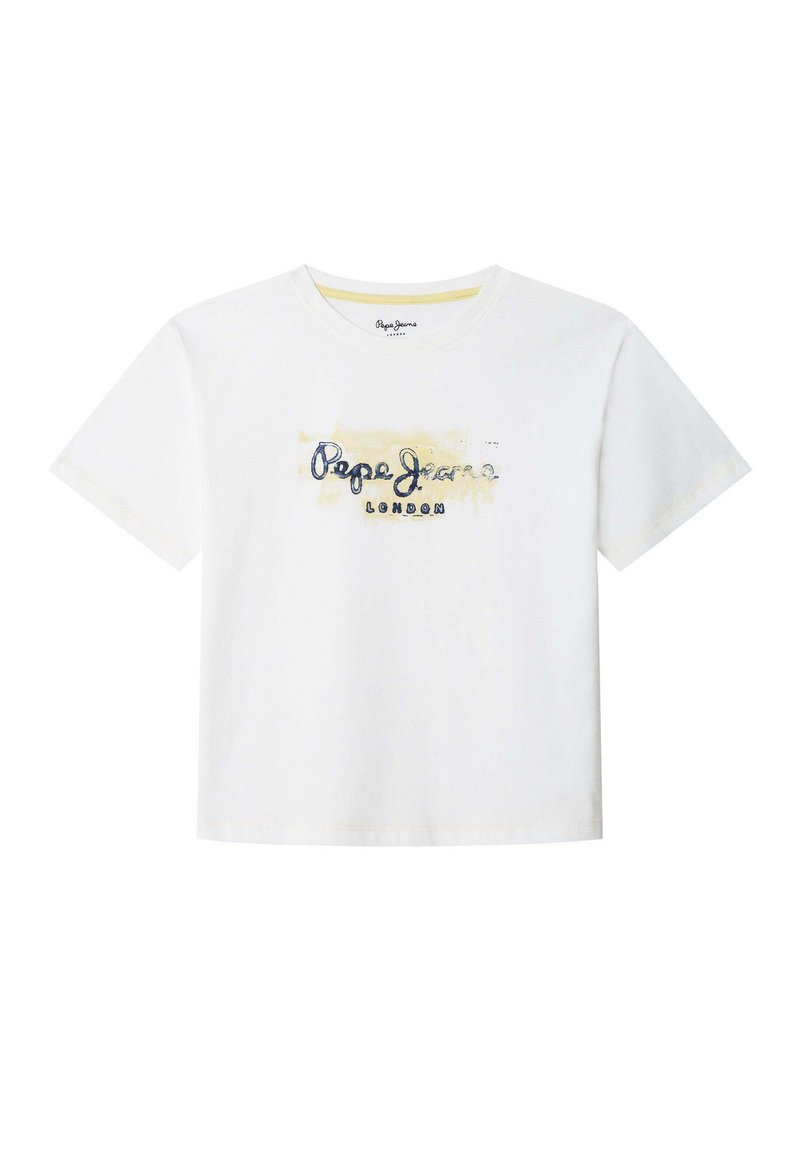 T-shirt en coton blanc avec col rond et manches courtes. Sur le devant, inscription "Pepe Jeans London" en impression graphique bleu et jaune.
