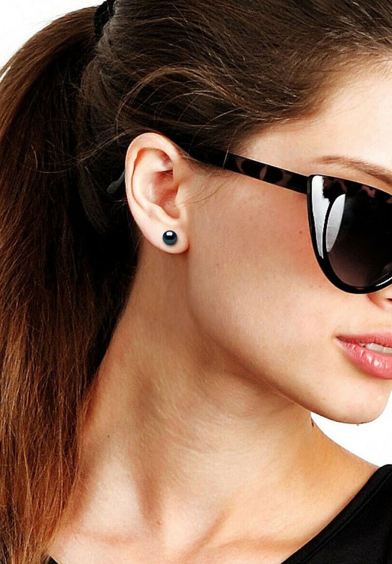 Femme aux cheveux bruns attachés en queue de cheval, portant des boucles d'oreilles rondes noires et des lunettes de soleil à monture écaille foncée, tournée vers la droite sur un fond blanc.