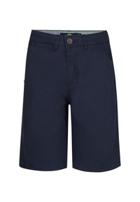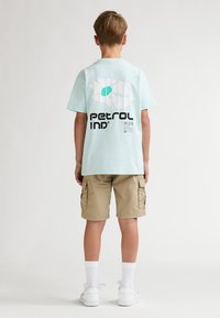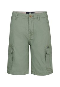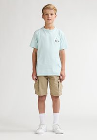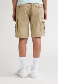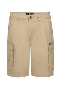 Shorts cargo beiges avec poches latérales, en coton, longueur jusqu'aux genoux. Portés avec des chaussettes blanches montantes et des baskets blanches.