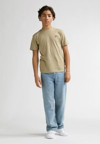 T-shirt en coton kaki à manches courtes, avec un petit motif graphique. Associé à un jean denim bleu clair et des baskets blanches. Fond uni.