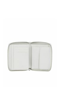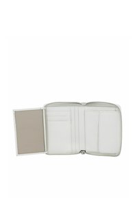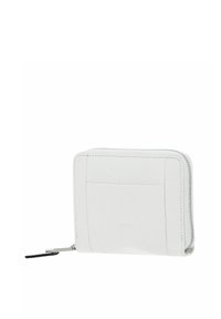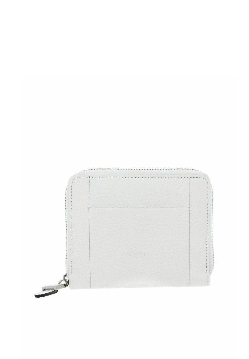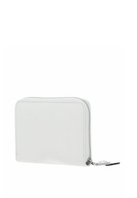 Portefeuille compact en cuir blanc avec zip tout autour, coutures visibles et poche extérieure sur le devant.