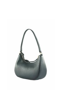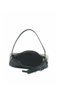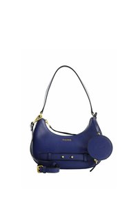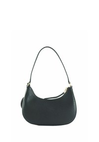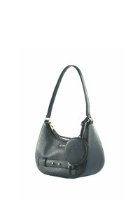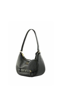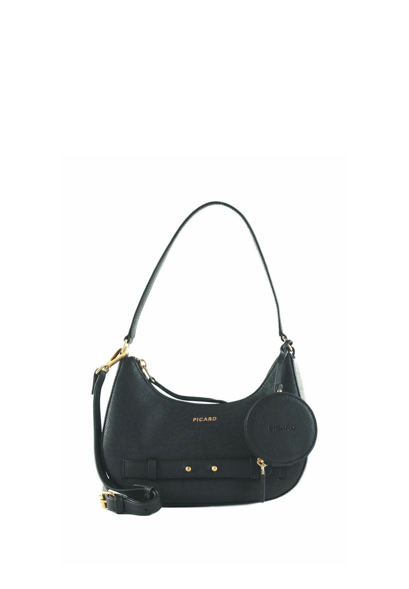Sac à bandoulière en cuir noir texturé avec quincaillerie dorée, pochette ronde détachable pour pièces de monnaie et sangle ajustable, marqué "PICARD" en lettres dorées.