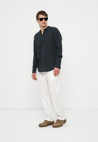 Jeune homme aux cheveux courts et bruns portant une chemise henley noire à manches longues et un pantalon blanc, debout devant un fond blanc uni.