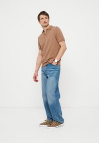 Homme portant un polo côtelé marron à manches courtes et un jean bleu, debout devant un fond blanc uni.
