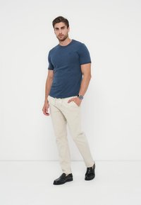 Homme aux cheveux bruns courts portant un T-shirt bleu marine à manches courtes et un pantalon beige, debout sur un fond blanc.