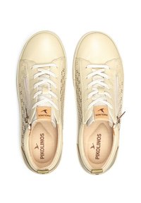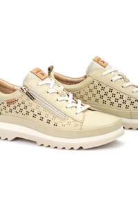 Baskets basses beiges avec fermeture éclair latérale, perforations florales, semelle blanche et languette de talon rembourrée, conçues pour un usage décontracté.