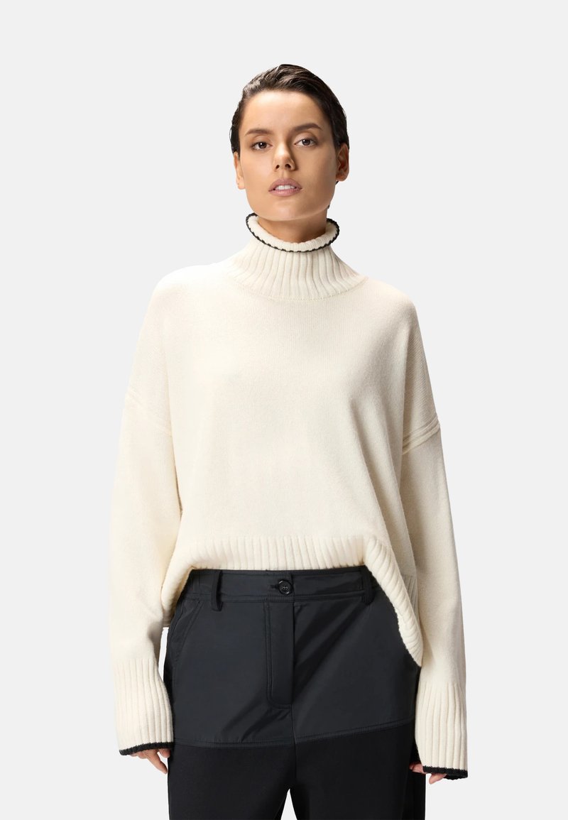 Pull oversize couleur crème avec un col montant côtelé, des poignets côtelés, et une bordure contrastante noire au niveau du col et des manches.