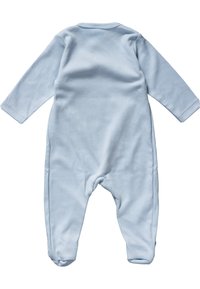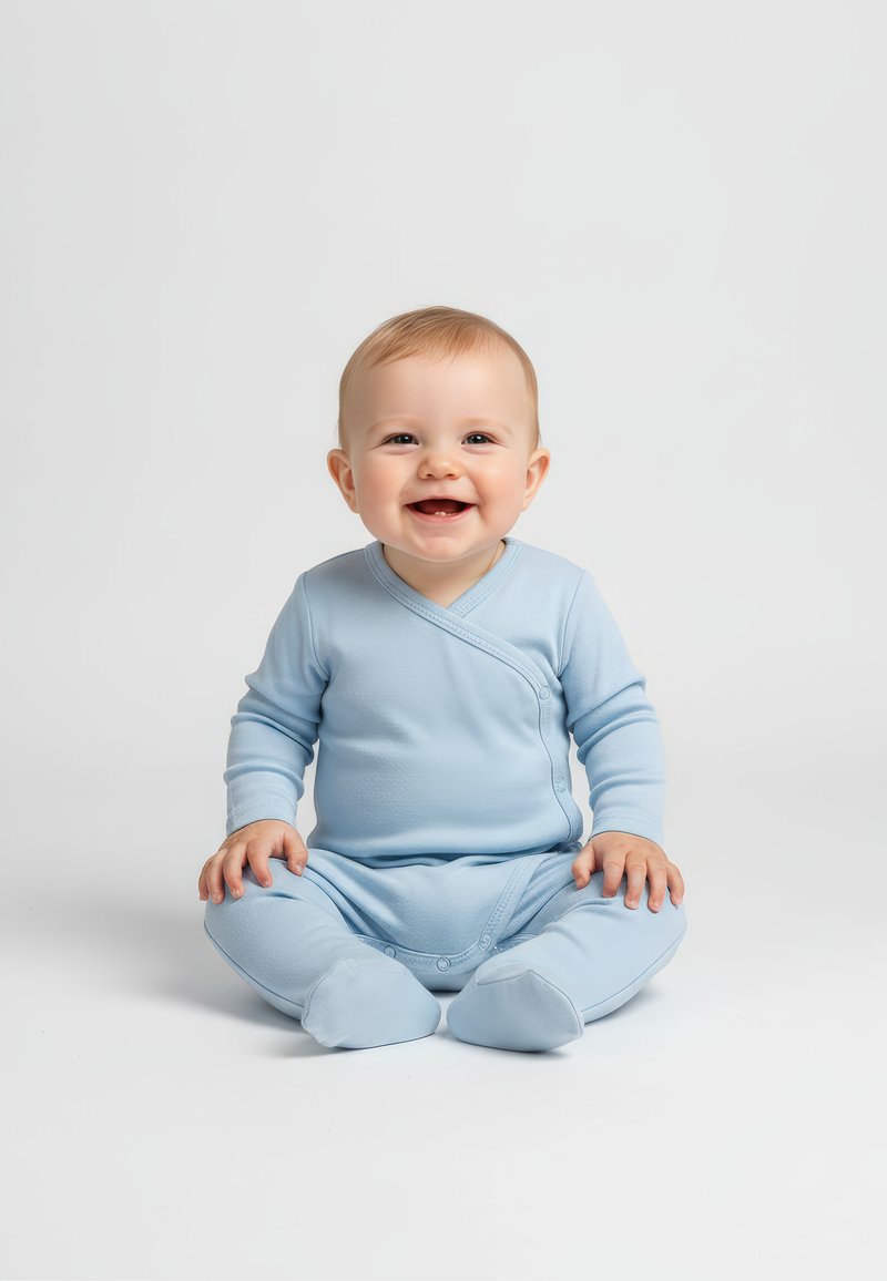 Bébé souriant assis sur une surface blanche portant une grenouillère bleue claire avec pieds, regardant devant lui avec les mains posées sur les genoux.