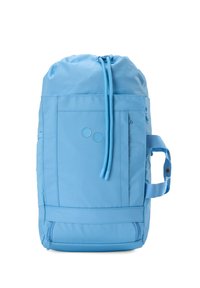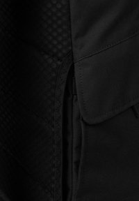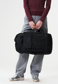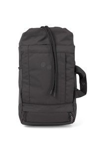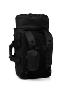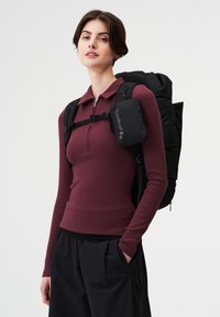 Femme portant un grand sac à dos noir à multiples poches, vêtue d'un chemisier à manches longues bordeaux et d'un pantalon noir, debout devant un fond blanc.