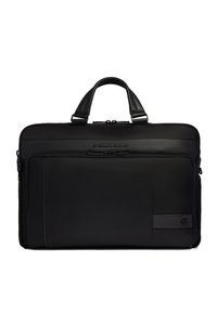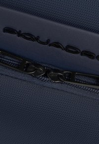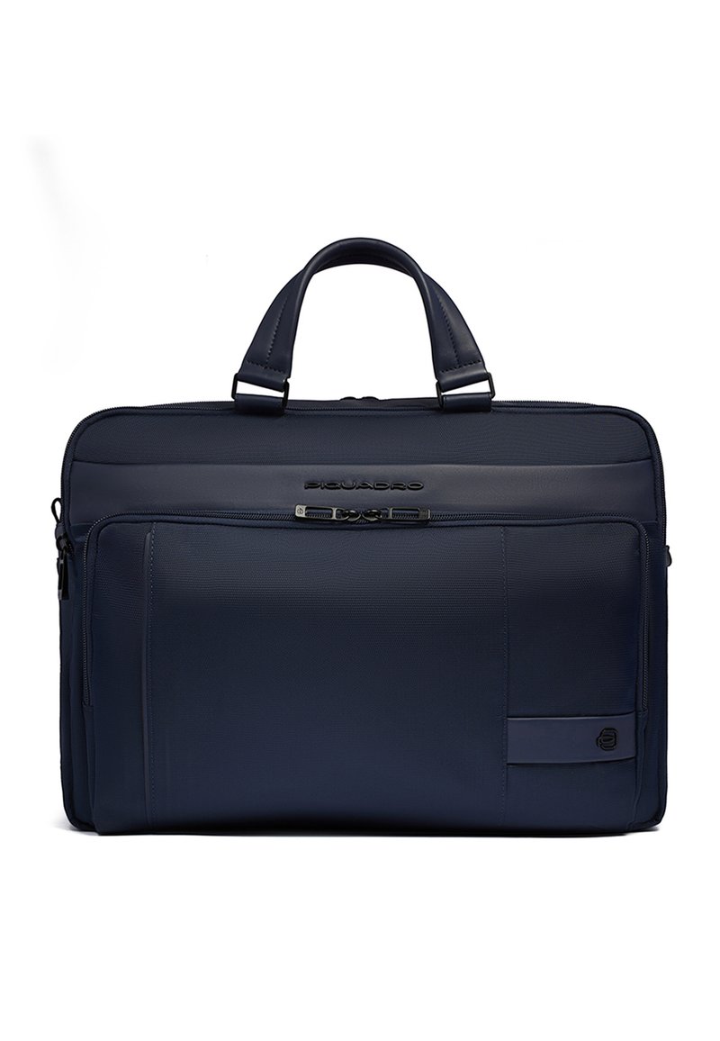 Malette bleu foncé avec deux poignées supérieures, poche avant zippée et logo de la marque Piquadro sur un matériau texturé.