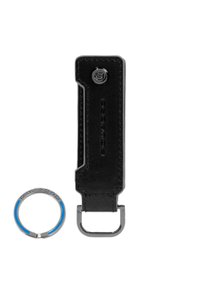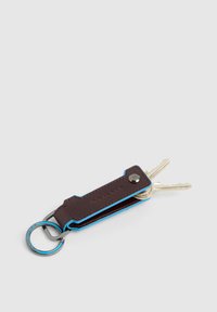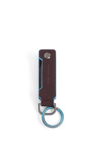 Porte-clés en cuir marron avec bords bleus, bouton-pression en métal et anneau métallique rond gravé du logo "Piquadro".