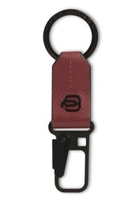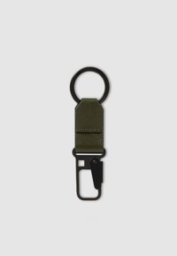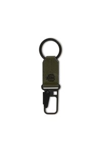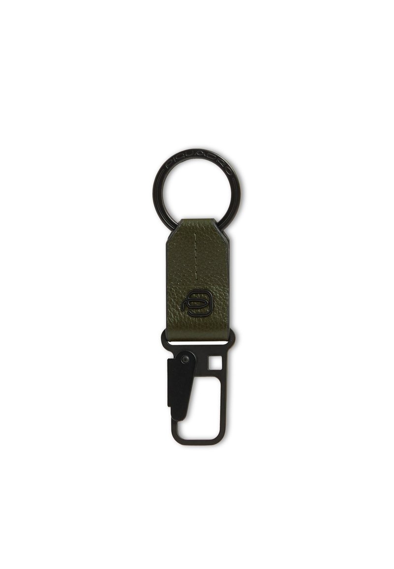 Porte-clés avec une lanière en cuir vert foncé, un anneau métallique et un mousqueton en métal noir fixé en bas.