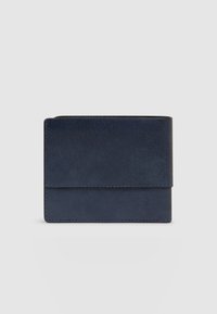 Portefeuille en cuir bleu foncé avec des coutures visibles et un petit logo de marque en métal au centre avant, sur fond blanc.
