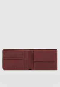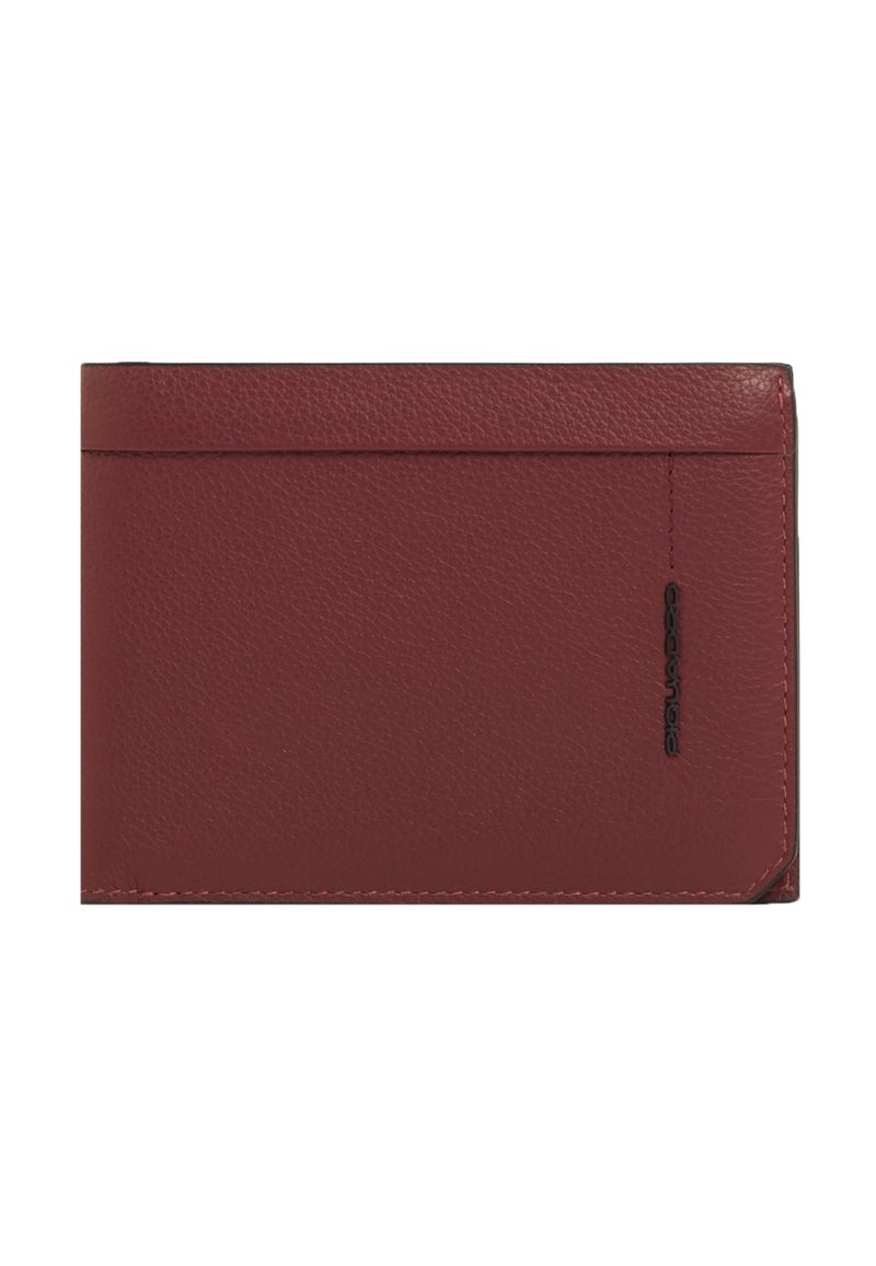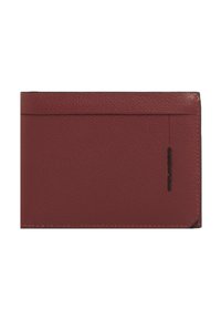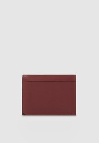 Portefeuille mince en cuir rouge foncé avec surface texturée, fente supérieure pour cartes, et petit logo de marque noir sur le bord droit.