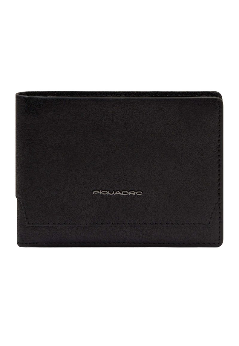 Portefeuille bi-fold en cuir noir à texture lisse avec le logo "Piquadro" argenté embossé au centre avant.