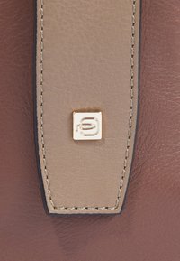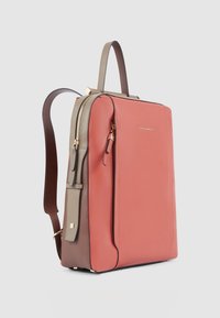Sac à dos carré en cuir corail avec bretelles beige, poignée supérieure, poche avant zippée et logo de la marque argenté centré sur le devant.
