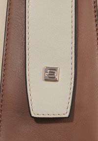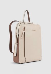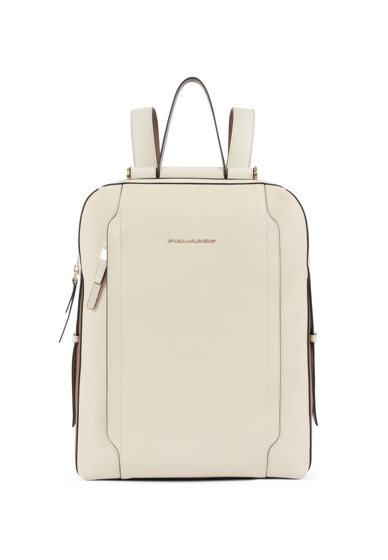 Sac à dos rectangulaire de couleur crème avec poignée supérieure, bretelles rembourrées, poche avant zippée et logo minimaliste au centre.