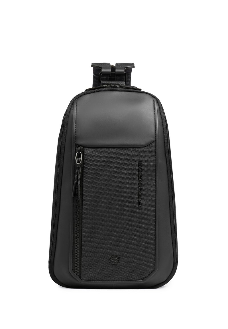 Sac à dos bandoulière noir compact avec panneaux lisses et texturés, poche zippée verticale à l'avant et sangle ajustable en haut.
