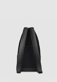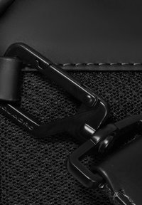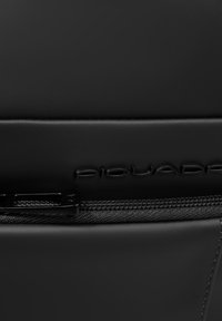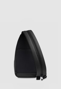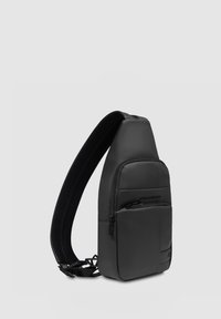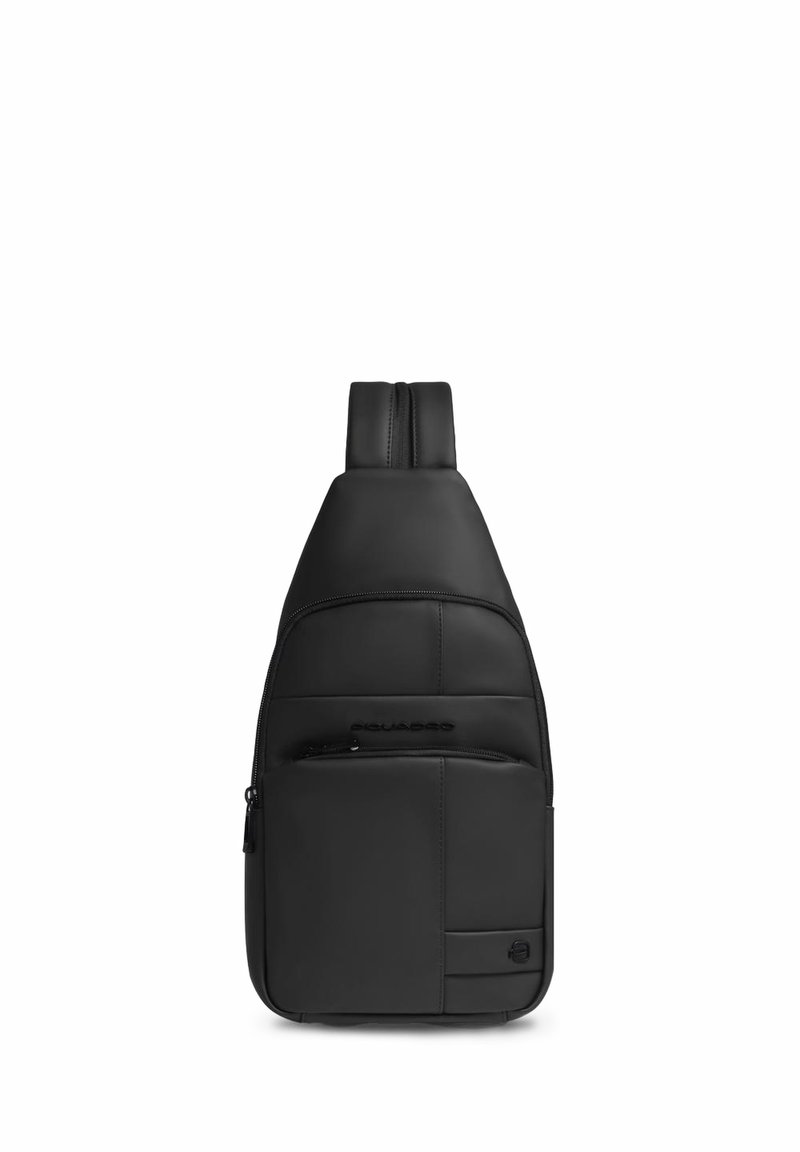 Sac à dos bandoulière en cuir noir avec sangle unique rembourrée, poche avant zippée et petit logo dans le coin inférieur droit.