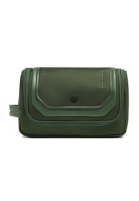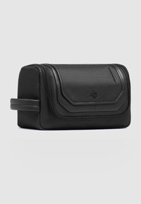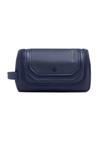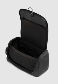 Trousse de toilette rectangulaire noire en tissu texturé, avec poche à rabat sur le devant, poignée latérale et logo Piquadro sur fond blanc.