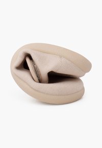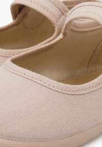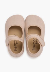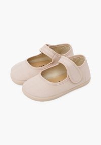 Chaussure Mary Jane en tissu beige avec bride auto-agrippante et semelle en caoutchouc souple, taille enfant, montrée de côté extérieur sur fond blanc.