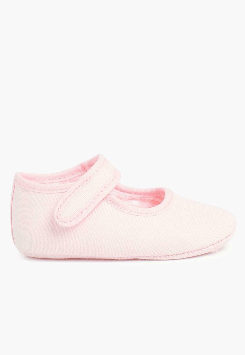 Ballerine en tissu rose avec une sangle Velcro, bout arrondi et doublure intérieure douce. Texture lisse et détails de couture minimalistes.