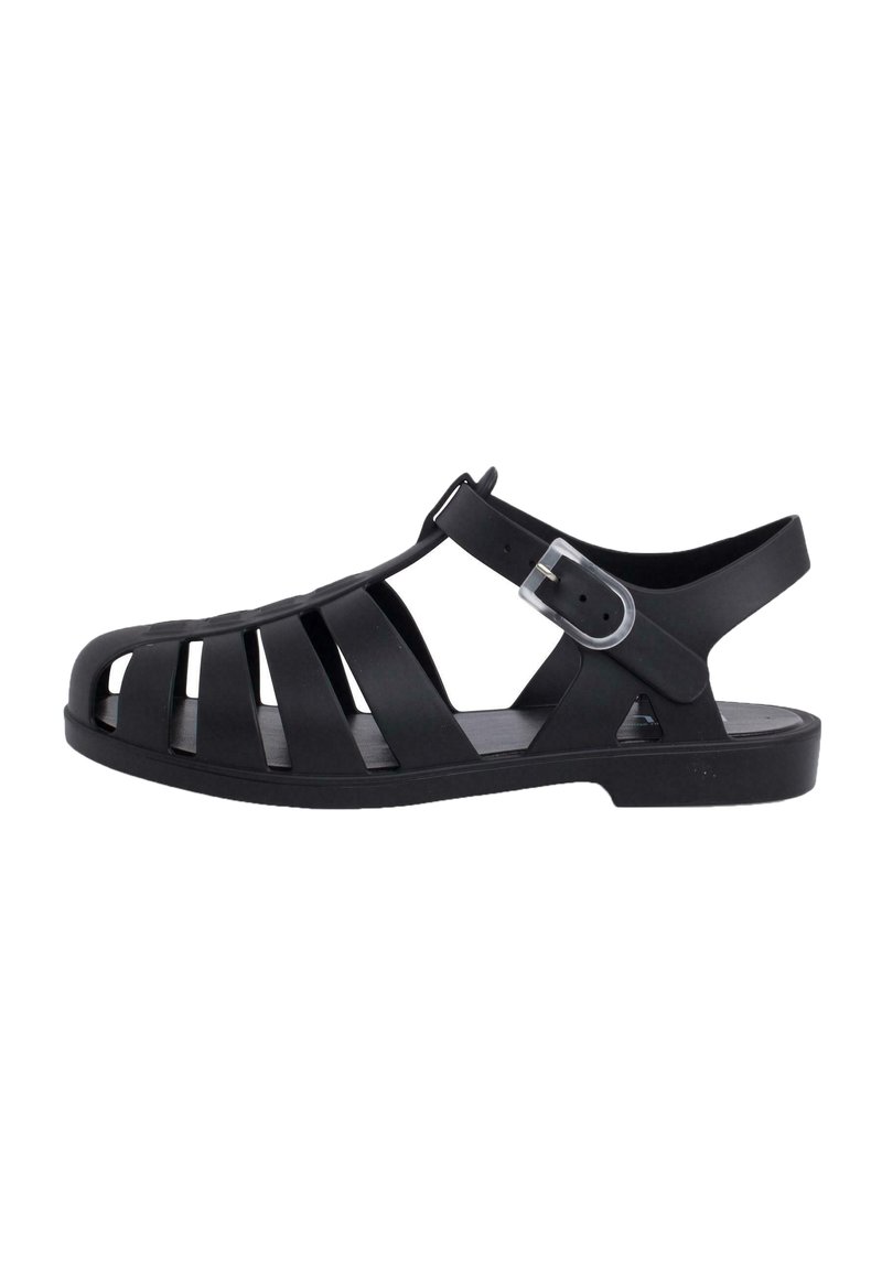 Sandale en caoutchouc noir présentant un design ouvert avec des découpes horizontales, une semelle rembourrée et une sangle de cheville réglable avec une boucle.