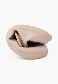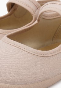 Chaussure en tissu beige avec une sangle Velcro, bout rond et doublure douce. Présente une semelle en caoutchouc flexible et un simple détail de couture.