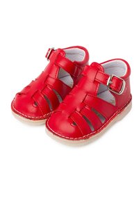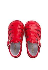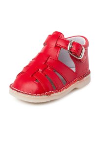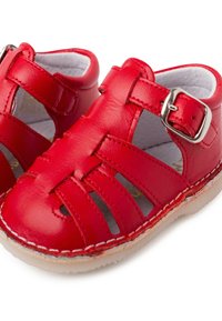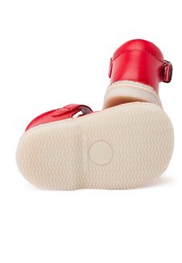 Sandale en cuir rouge avec un dos fermé, fermeture à boucle et design découpé. Semelle beige douce avec coutures contrastées pour plus de détail.