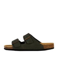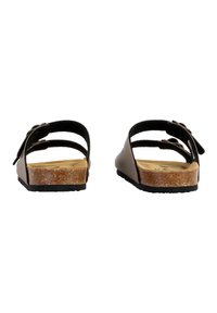 Sandale slide marron avec deux brides réglables à boucle, lit de pied en liège et semelle texturée noire, vue de profil sur fond blanc.