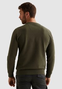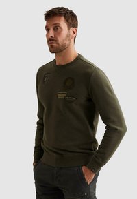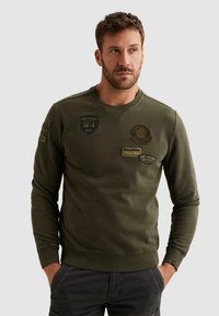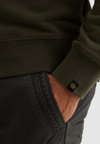 Homme portant un sweat-shirt vert olive avec des patchs de style militaire, les mains dans les poches, regardant légèrement sur le côté sur un fond uni.