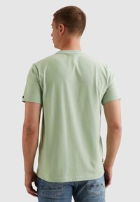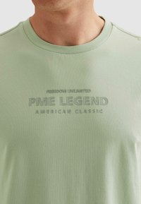 Homme aux cheveux courts portant un T-shirt vert clair PME Legend et un jean bleu, debout les bras croisés devant un fond uni.