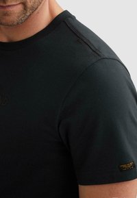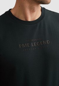 Homme portant un t-shirt noir PME Legend à manches courtes et un pantalon cargo sombre, debout avec une main dans la poche, regardant légèrement sur le côté.
