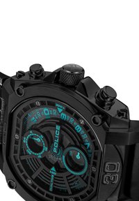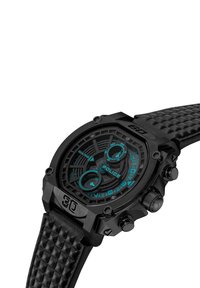 Montre chronographe noire avec un bracelet texturé, cadran noir avec des accents turquoise, double fuseau horaire et marqueurs d'heure bien visibles.