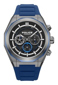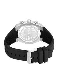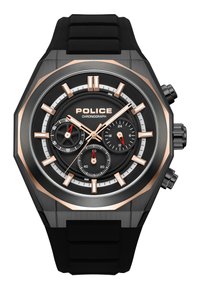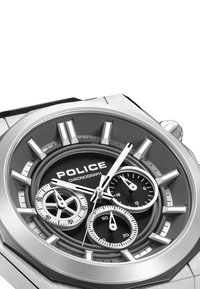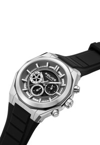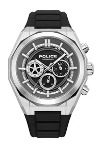 Montre chronographe pour hommes Police avec cadran noir, trois sous-cadrans, marqueurs argentés, boîtier octogonal en acier inoxydable, et bracelet en caoutchouc noir.