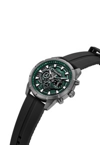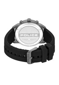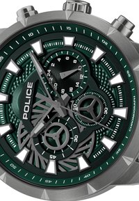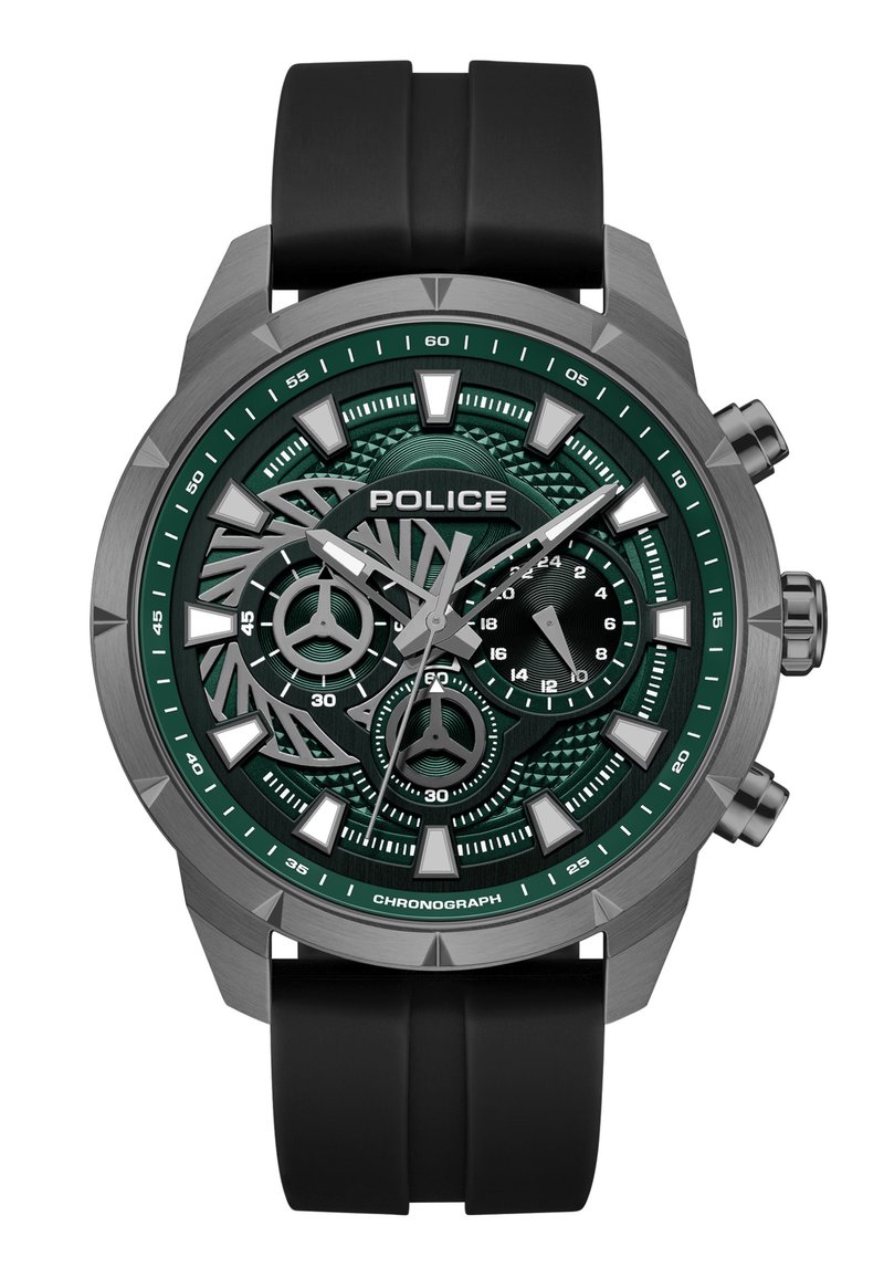 Montre chronographe avec cadran texturé vert, index argentés, trois sous-cadrans, bracelet en silicone noir, et logo "POLICE" sous 12 heures.