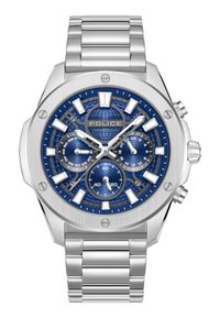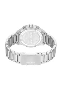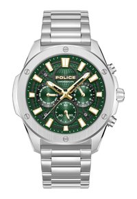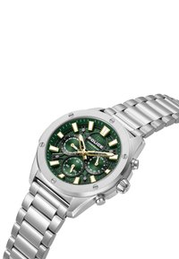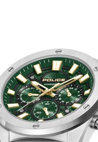 Poignet gauche portant une montre chronographe en métal argenté avec un cadran noir et des aiguilles dorées, sur un fond de chemise noire à manches longues.