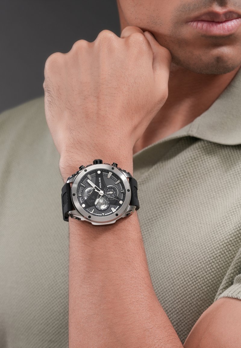 Homme portant une montre chronographe argentée et noire avec un cadran noir et plusieurs sous-cadrans au poignet gauche, vêtu d'un polo vert texturé.